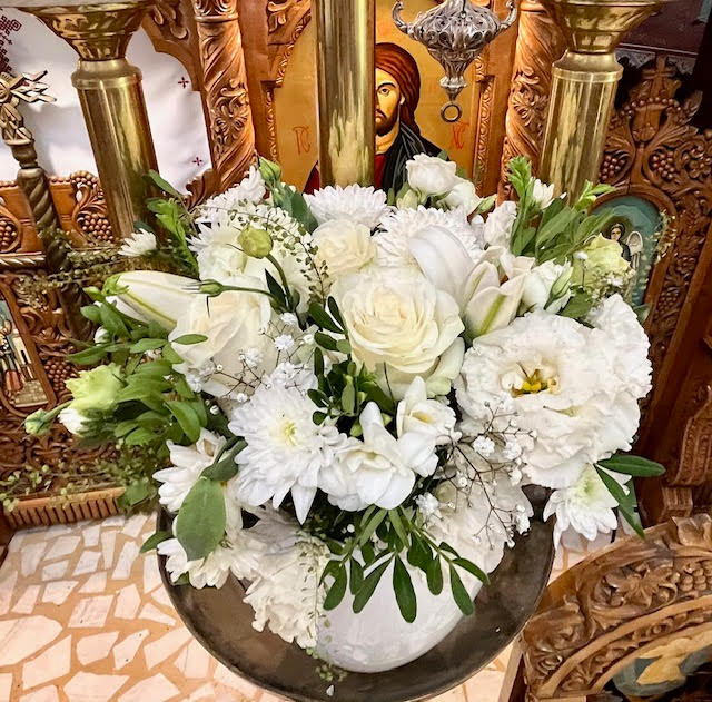Aranjament biserica cu flori naturale( frezie, eustoma, trandafiri, crin, crizantema) și verdeața